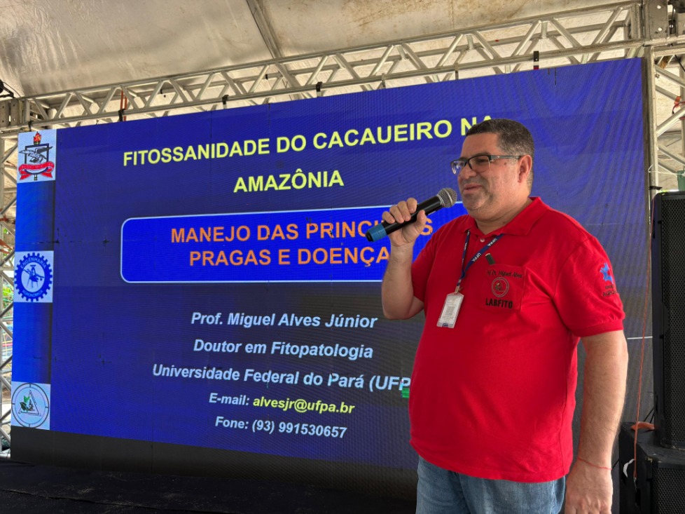 O professor Miguel Alves Júnior, da Universidade Federal do Pará (UFPA), detalhou as atividades realizadas no campo, destacando a importância da poda para a sanidade das plantas. “Hoje, primeiramente, entramos em uma lavoura que estava um pouco adensada e que, por isso, estava favorecendo o aparecimento de pragas e doenças. Fizemos um manejo de poda, rebaixando uma planta adulta e abrindo a copa para que o ar e a luz entrassem na plantação. Em seguida, mostramos um pouco das doenças que são favorecidas quando a lavoura está escura e adensada, como a podridão-parda e a vassoura-de-bruxa, para que os produtores pudessem ver a diferença de um para o outro.”