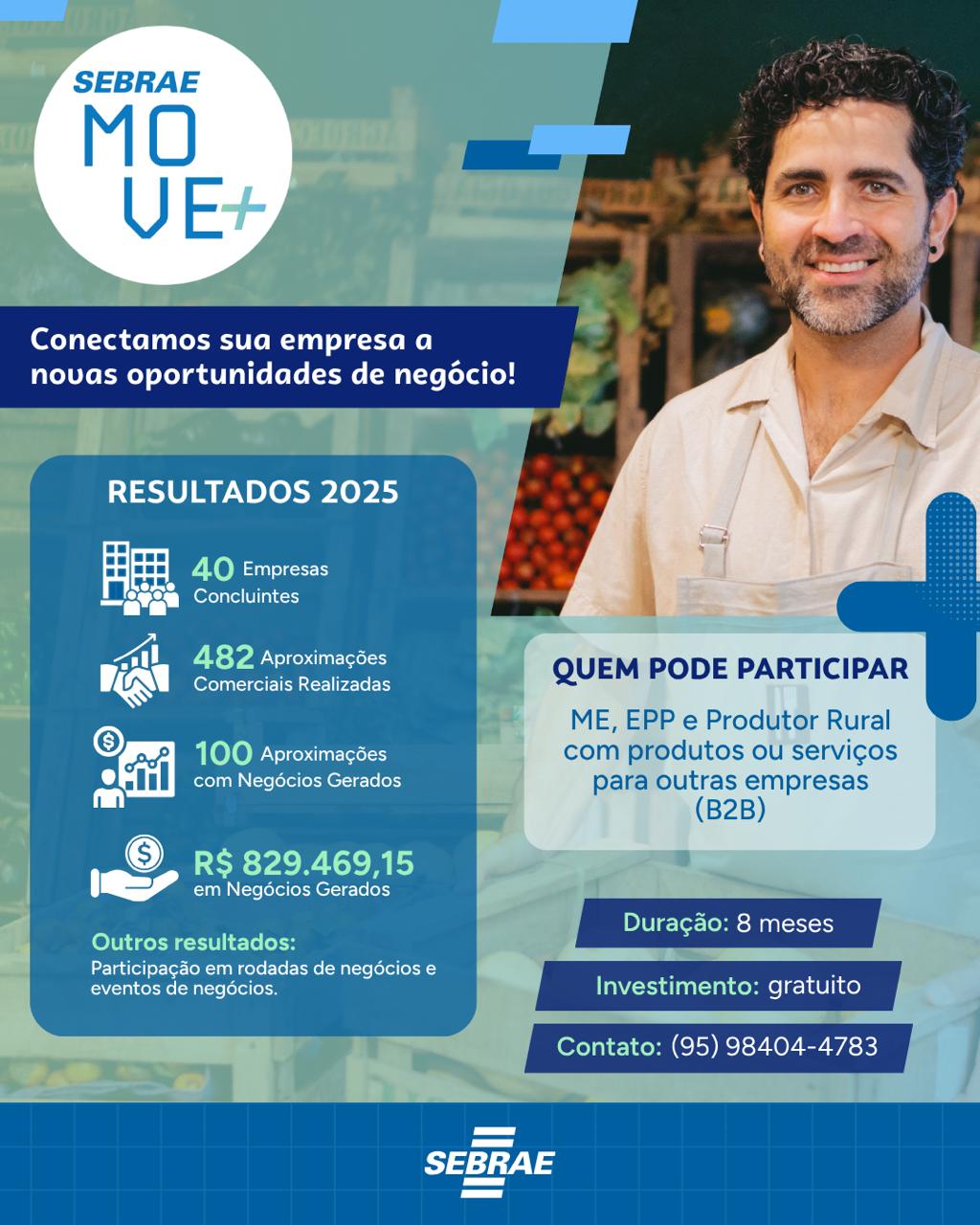 A ação integra o programa MOVE+ e oferece acompanhamento estratégico ao longo de oito meses, com o suporte de um consultor dedicado. Durante esse período, os participantes terão acesso a ferramentas de gestão, diagnóstico de portfólio, orientações comerciais e oportunidades de networking, incluindo rodadas de negócios com potenciais compradores.