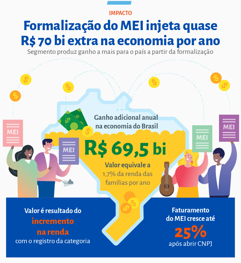 A atuação dos microempreendedores individuais (MEI) é responsável pela movimentação de bilhões de reais por ano no país. Avaliação de impacto inédita, realizada pelo Sebrae em parceria com a Fundação Getúlio Vargas (FGV), revela que o efeito da formalização do MEI gira entre R$ 19,81 bilhões e R$ 69,56 bilhões. Esse incremento é estimulado pelo aumento de renda que os donos de pequenos negócios obtêm ao se formalizarem. Ao conquistarem um CNPJ, eles aumentam sua renda entre 7% e 25%.