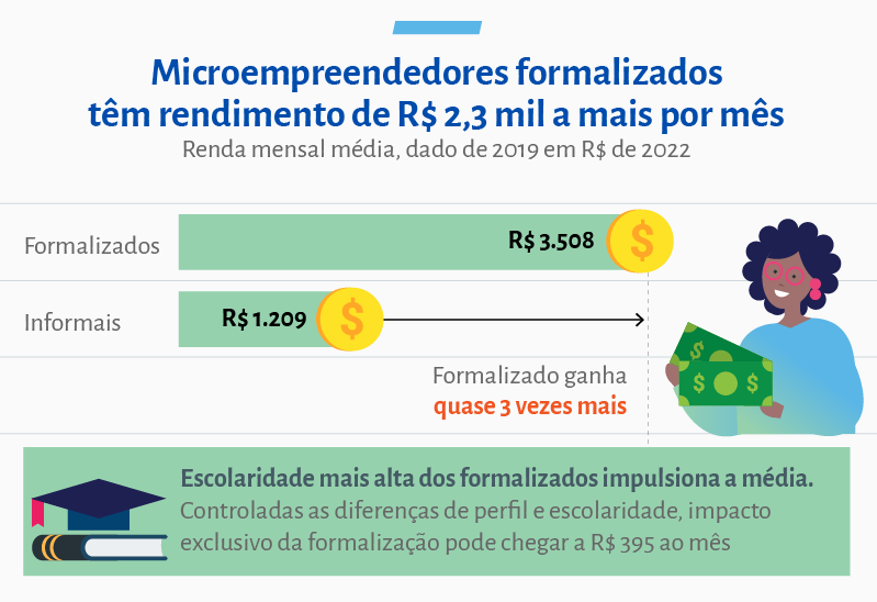 O levantamento do Sebrae ainda detectou que os empreendedores por conta própria formalizados há algum tempo, que são em quase sua totalidade MEI, têm rendimento médio de R$ 3.507,57. Já quem não é formalizado tem renda média de R$ 1.208,61. Parte dessa diferença se explica pela escolaridade maior do primeiro grupo. Porém, quando controlado para as diferenças de perfil e escolaridade dos dois grupos de empreendedores, a formalização por si só é responsável por um ganho de até R$ 395 por mês.