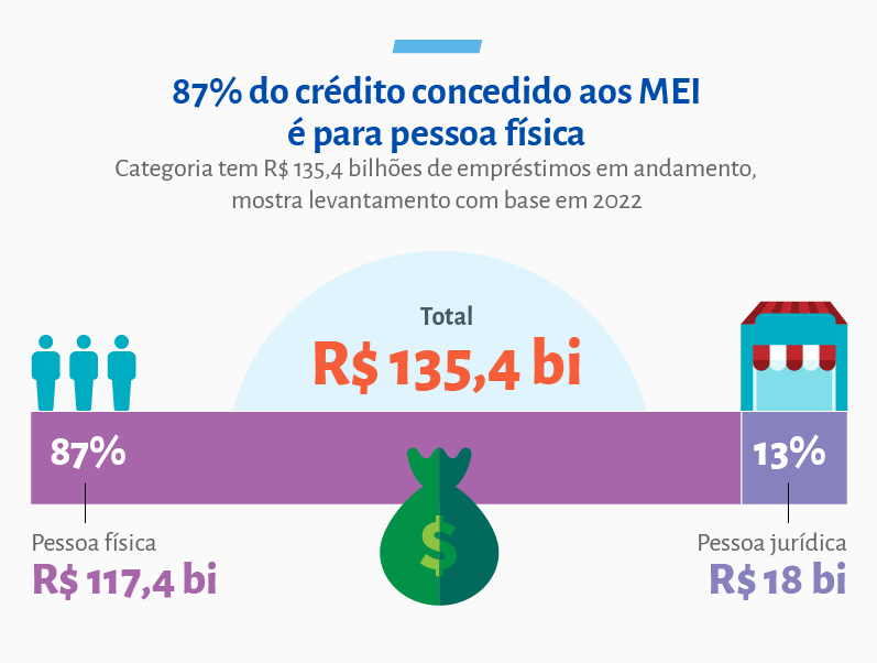 No fim de 2022, os microempreendedores individuais (MEI) possuíam um estoque de crédito de R$ 135,4 bilhões, sendo que desse montante R$ 117,4 bilhões, o que equivale a 87% do valor total, foram solicitados por esses empreendedores como pessoa física e apenas R$ 18 bilhões por meio de pessoas jurídicas. O universo de tomadores é de 844,2 mil como pessoas jurídicas e outros 5,3 milhões como pessoas físicas.