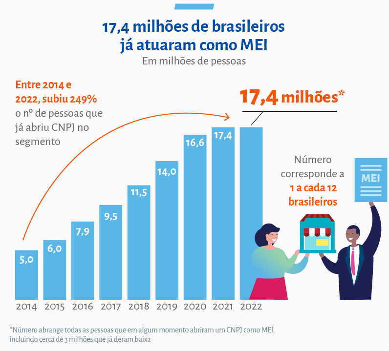Desde o início da figura jurídica do MEI, cerca de 17,4 milhões de brasileiros tiveram em algum momento um CNPJ de Microempreendedor Individual, o que corresponde a 1 a cada 12 brasileiros. O levantamento mostra que houve um crescimento de cerca de 215% entre os anos de 2014 e 2022, quando o número de formalizados saltou de 4,6 milhões em 2014 para 14,6 milhões em 2022.